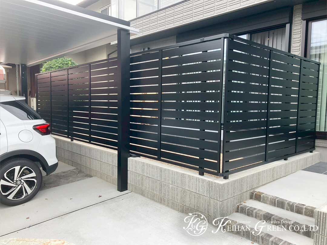 建物に面したテラス部分にはブラックの横格子フェンスを設置。