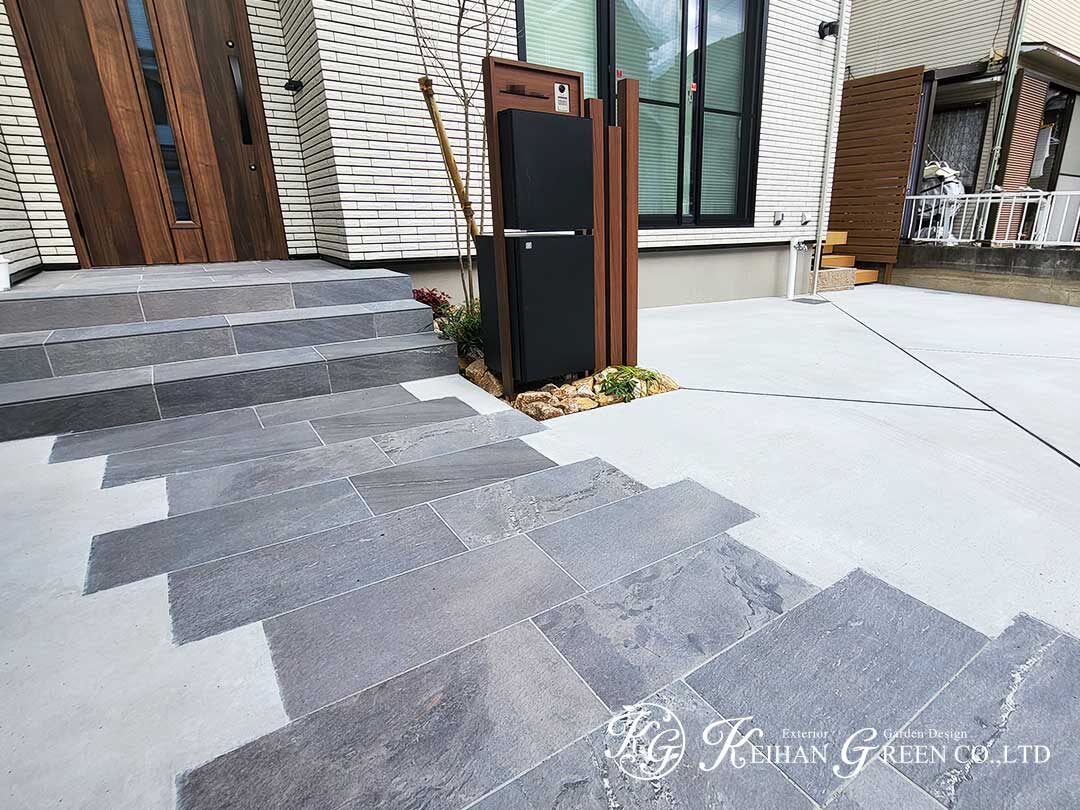 アプローチはグレートーンの平板でリズムをつけ、土間コンクリートとの切り替えをくっきりと。