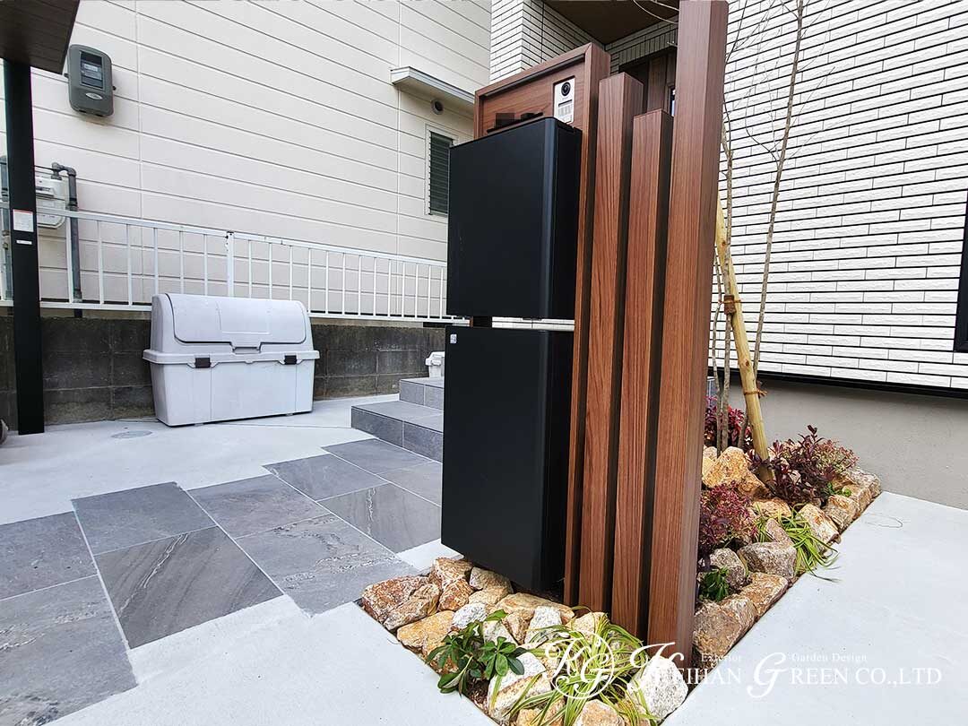 今回の見どころは、機能門柱とサイクルポートを「木目×ブラック」で揃えた統一感と、建物横のウッドデッキ+目隠しフェンスで“使える場所”をきちんと確保している点。