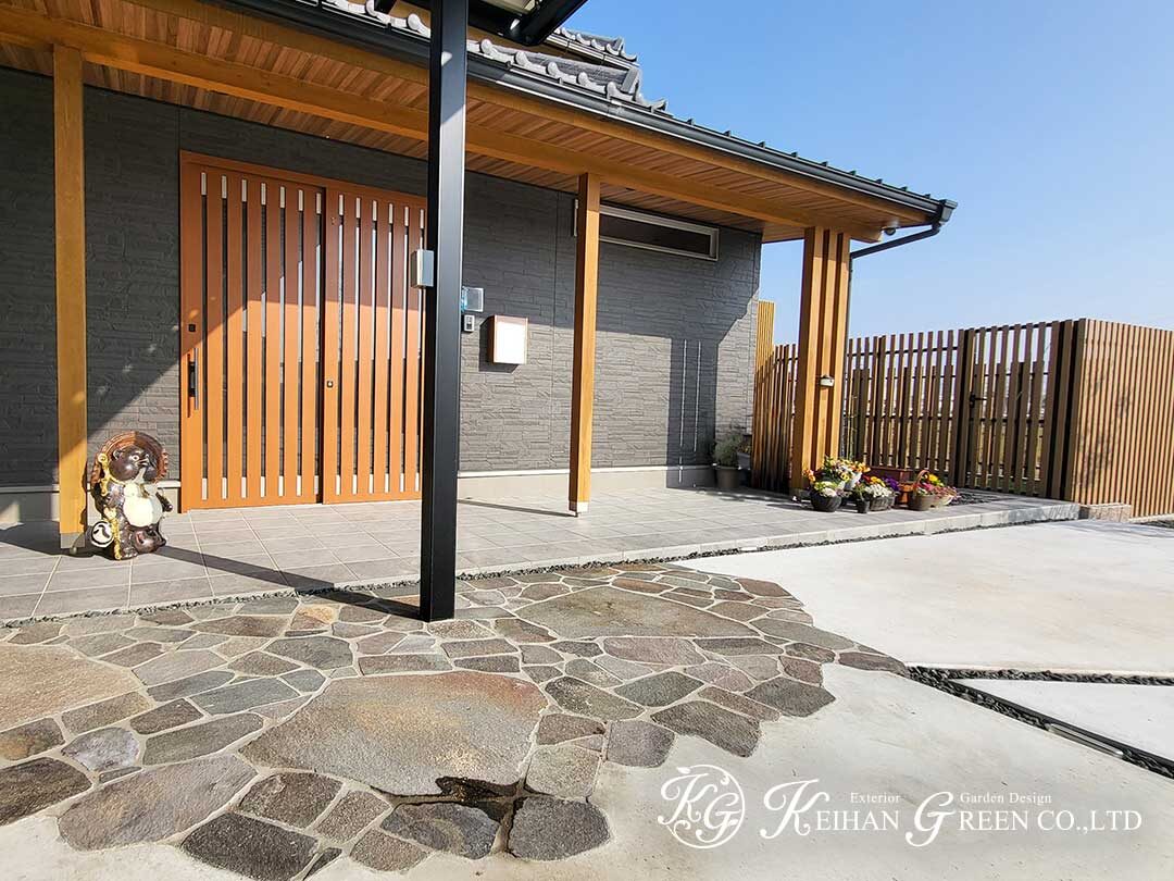 今回は、カーポート・土間・玄関前の石張り・庭の人工芝・ウッドデッキ・目隠しフェンスをトータルで施工した事例をご紹介。