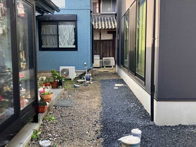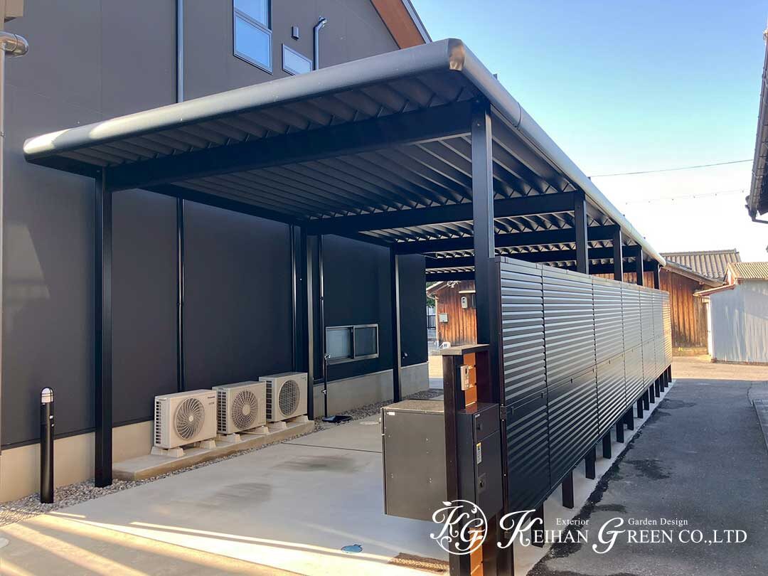カーポート下は長い動線になるため、建物側に並ぶ室外機などの設備スペースが目に入りやすい場所でもあります。
