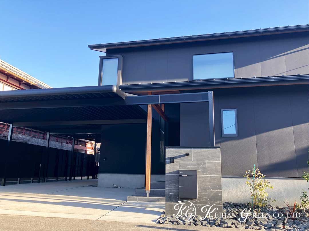 外構は建物外観に合わせてブラックを基調にまとめ、カーポートやスクリーンも黒で統一しています。