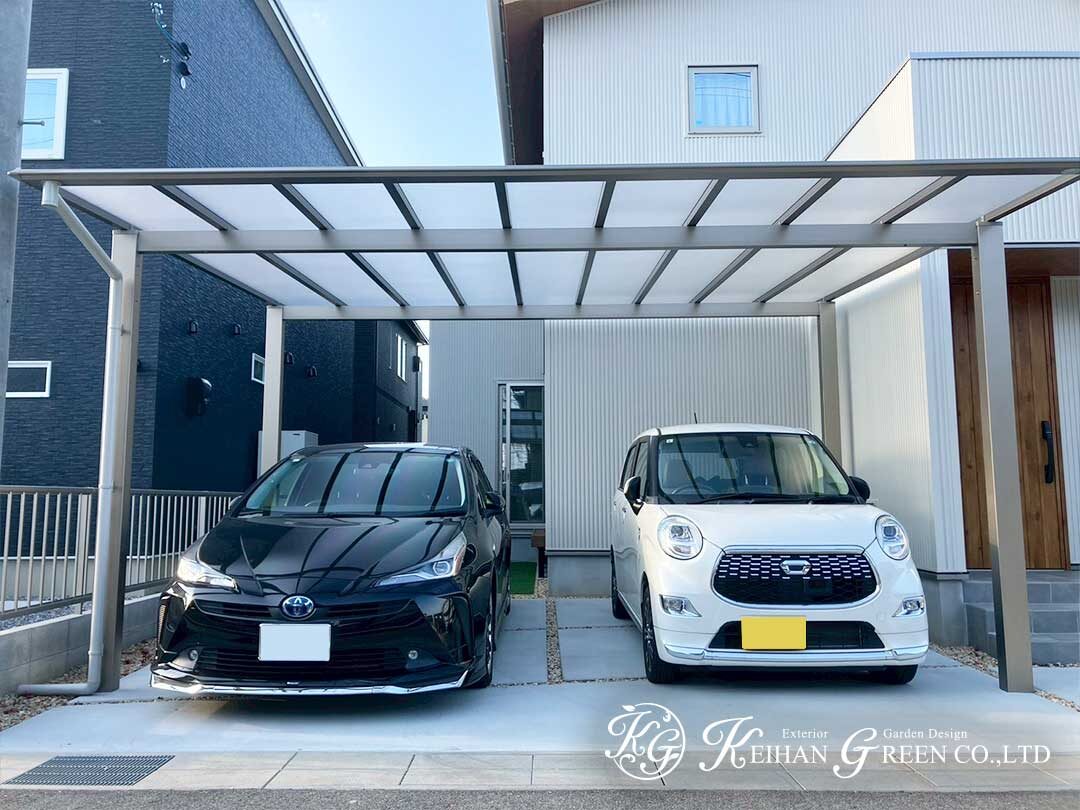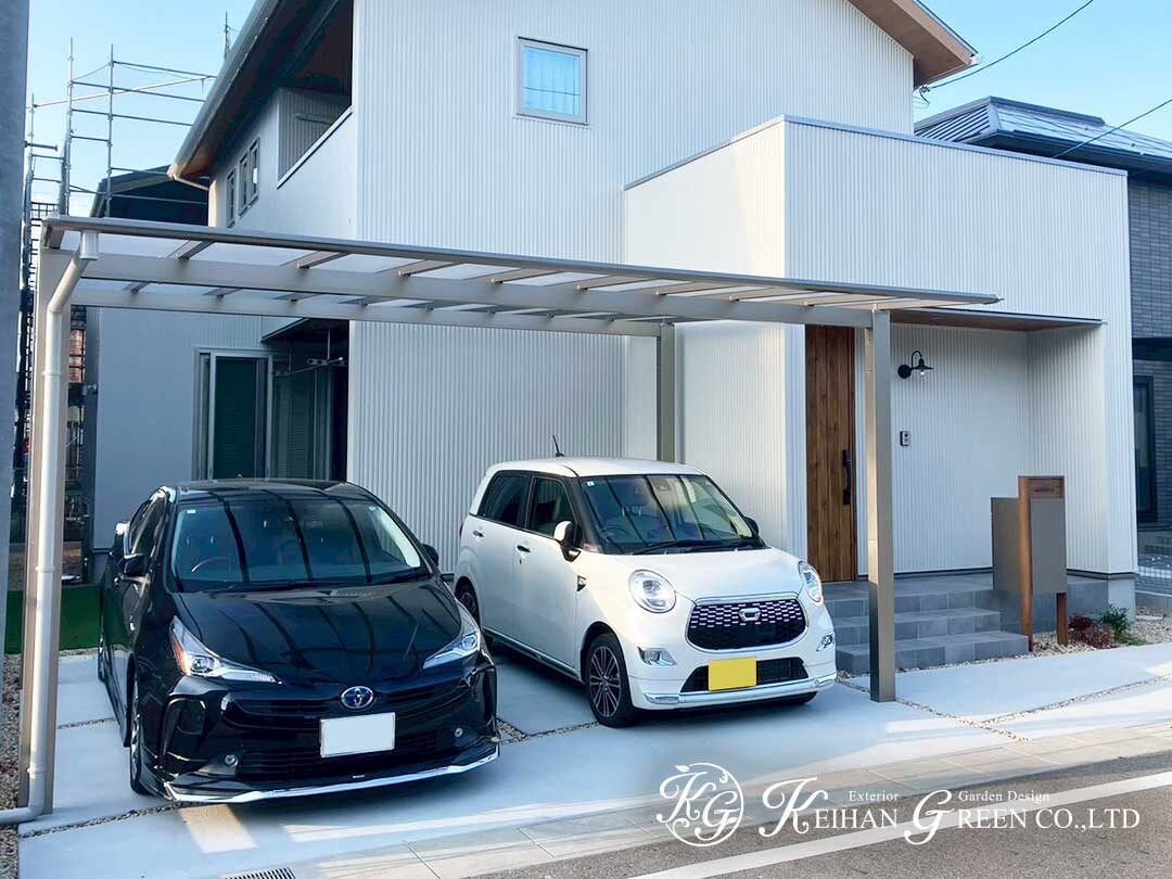 明るいフレームと採光性のある屋根材が、圧迫感を抑えつつ駐車スペースをしっかりカバーします。